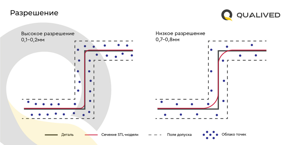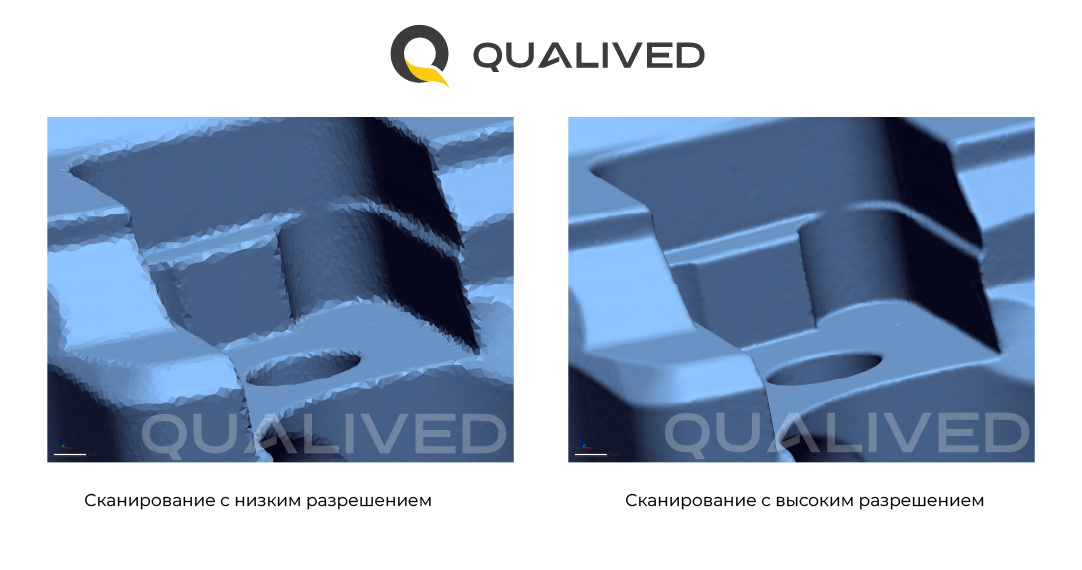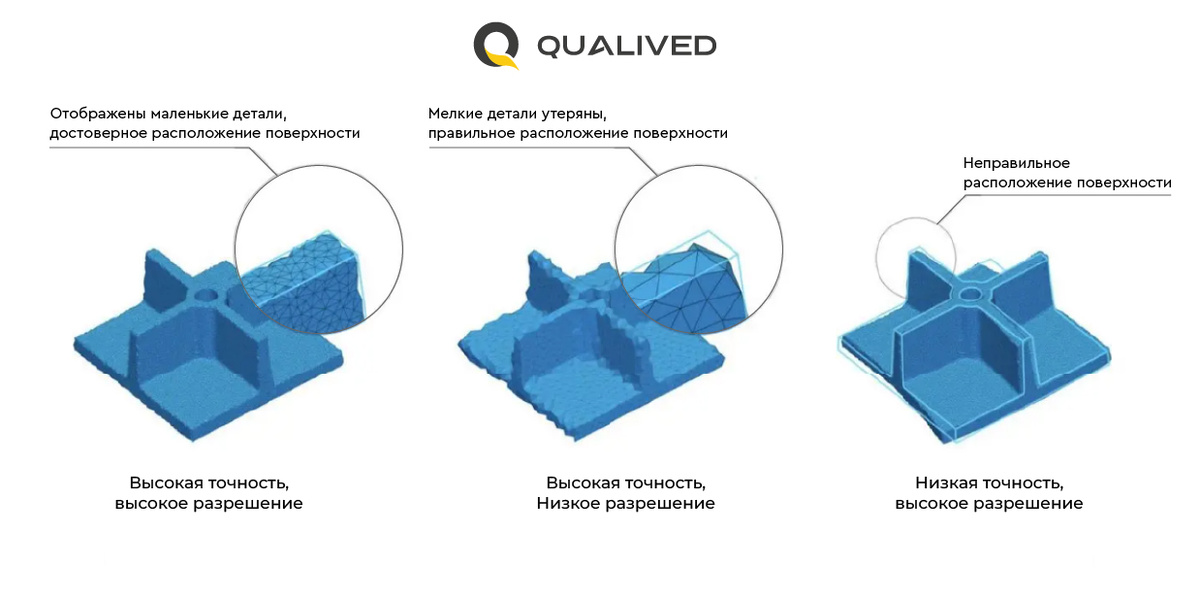 При этом важно учитывать, что разрешение напрямую не влияет на точность получаемых данных, но низкое значение этого параметра может искажать геометрию, в особенности на углах, что приведет к косвенному ухудшению точности.