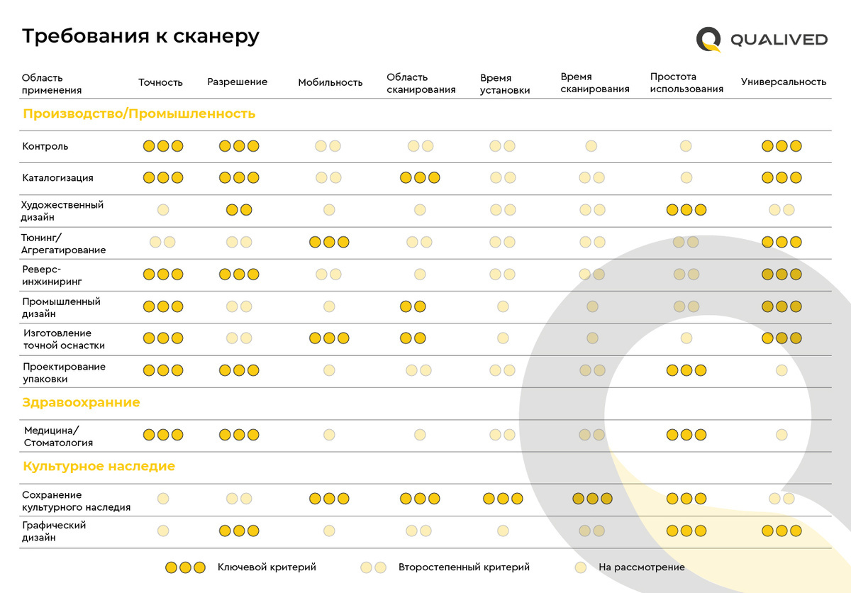 Приоритетность тех или иных характеристик 3D-сканера также варьируется в зависимости от области применения. Так например, в промышленном дизайне на первое место встает точность и универсальность оборудования, а простота использования считается менее значимой.