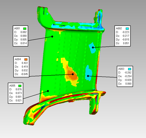 Мы провели сканирование новых и старых лопаток, построили их точные математические модели и сравнили их между собой.